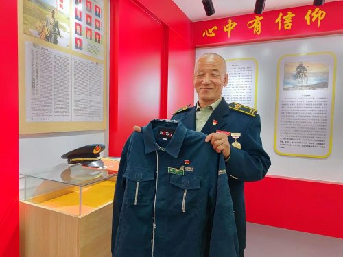 10月25日,木壘縣博斯坦鄉(xiāng),馬進(jìn)福向記者展示自己的第一套郵政制服。