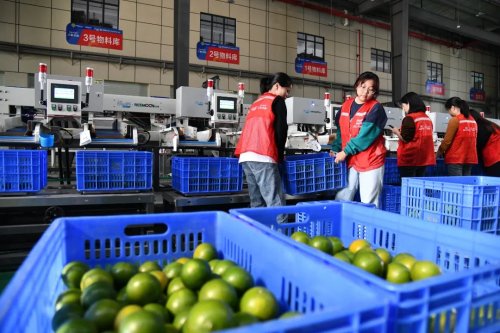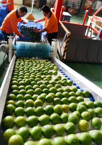 偌大的處理中心里,水果處理插上了智能化“翅膀”。一筐筐水果被送上智能分揀機(jī)器,按口徑大小從不同的格口被分揀出來后,再進(jìn)行打包裝箱。