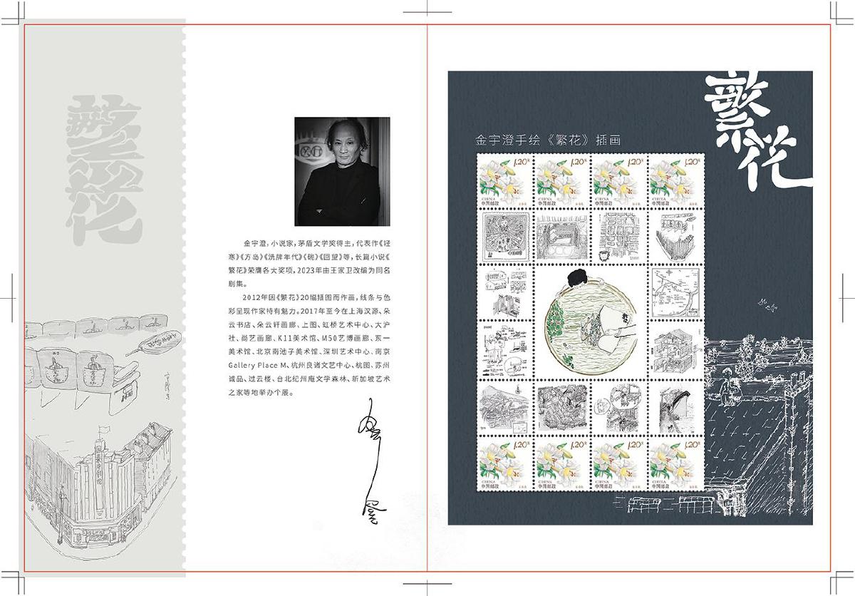 上海市分公司集郵與文化傳媒部集郵業(yè)務(wù)室項(xiàng)目負(fù)責(zé)人賈寅承擔(dān)著與金宇澄對(duì)接設(shè)計(jì)的工作。在數(shù)次的線上和線下聯(lián)系中,他感觸良多:“這次整體的溝通過程,讓我感受到了劇中經(jīng)常提到的‘不響’的處事態(tài)度。”據(jù)賈寅回憶,金宇澄在雙方明確意向當(dāng)天,就對(duì)所有手繪插圖稿進(jìn)行整理,精心挑選出反映小說中經(jīng)典瞬間和場(chǎng)景的13幅插畫,隔天就提供給上海市分公司進(jìn)行設(shè)計(jì)制作,這種目標(biāo)清晰、悶聲做事、執(zhí)行高效的態(tài)度讓他印象深刻。對(duì)于圖稿的細(xì)節(jié),無論是字體還是顏色,金宇澄都一一斟酌、反復(fù)推敲,“‘繁花’二字與郵票邊框處銜接應(yīng)該是截平,而不是圓筆”“房子和屋頂是個(gè)標(biāo)志,盡量露出來”“郵票上的展現(xiàn)應(yīng)該比書本更精確”……賈寅感慨道:“從這數(shù)次溝通中,我感受到了他們這代人的郵票情懷,他們是真的懂集郵。我也感受到了他們高超的文化素養(yǎng)和審美水平。”