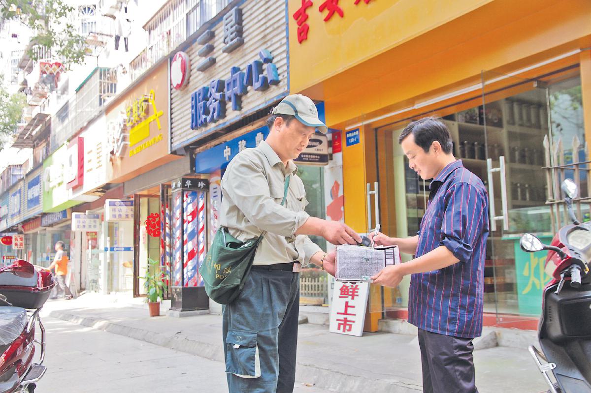 吉州區鷺洲投遞部攬投員周東亮上門為客戶收寄郵件。 □郭曉燕 攝