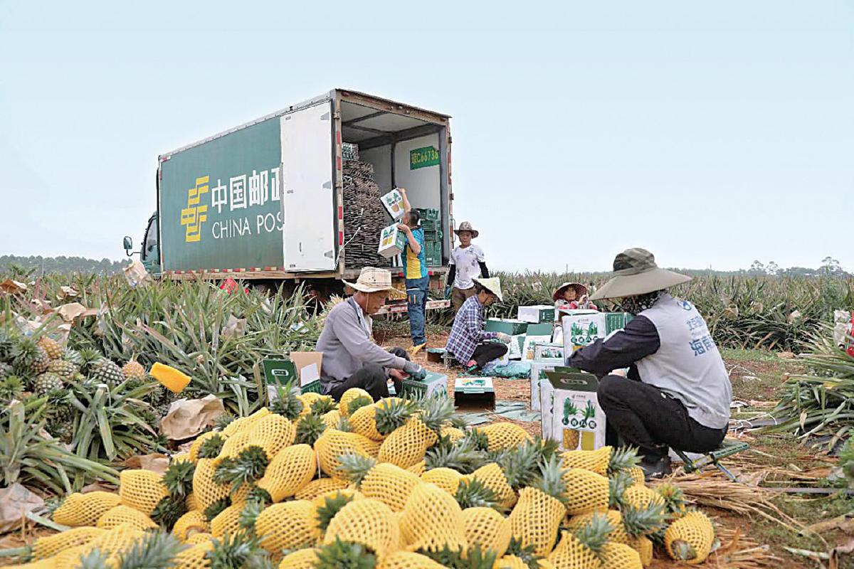 郵政工作人員在美香村種植基地現場收寄鳳梨。 □孟凡盛 攝