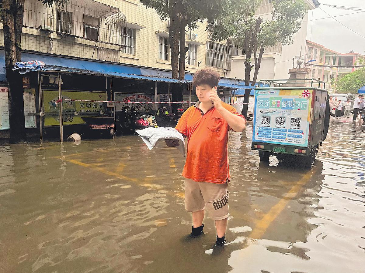 南寧市郵政分公司投遞員蹚著積水堅持投遞。
