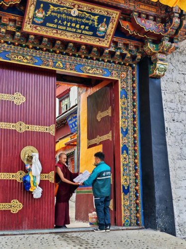步行10分鐘,羅布多吉來到拉郊鄉(xiāng)政府,將《人民日?qǐng)?bào)》和郵件送達(dá)后,便驅(qū)車前往德瑪龍村。