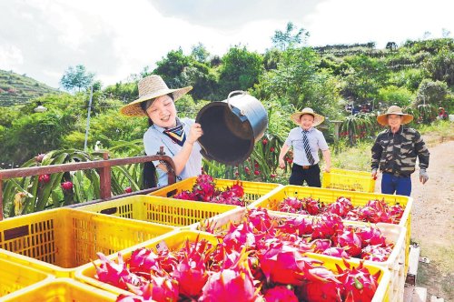 時下,位于廣東省云浮市云安區(qū)鎮(zhèn)安鎮(zhèn)石都村的農(nóng)業(yè)龍頭企業(yè)——盈科生態(tài)農(nóng)業(yè)科技有限公司規(guī)模達600畝的高山火龍果基地內(nèi),一顆顆“紅燈籠”掛滿枝頭,工人們忙碌地采摘、搬運、分揀、裝車,每天有超過5噸的火龍果從這里郵寄到全國各地。
