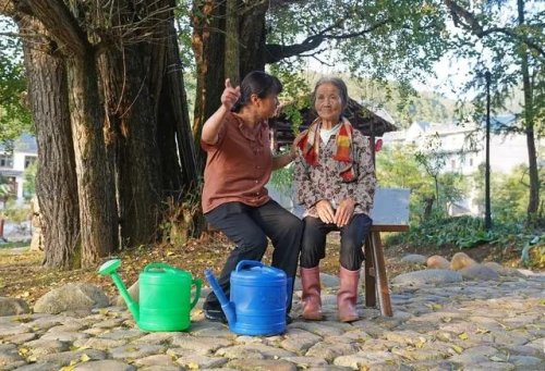 這是在江西省鉛山縣陳坊鄉沽溪村,羅細英(右)與相識的村民溫春香敘舊(9月28日攝)。新華社記者 萬象 攝