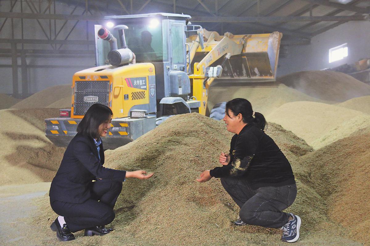 吳志霞向烏魯木齊市分行客戶經(jīng)理孔阿朵介紹稻谷歸倉情況。