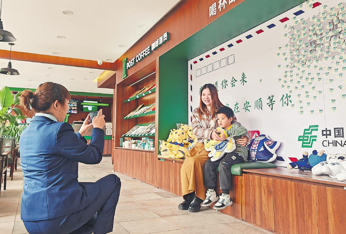 伴隨貴州省安順市打造城市旅游品牌的步伐,安順市郵政分公司深入推進(jìn)文旅融合,與安順旅游集團(tuán)文創(chuàng)商品發(fā)展有限公司攜手打造“郵局咖啡·遇見安旅店”。店內(nèi)裝修兼具郵政特色、古城風(fēng)格與現(xiàn)代風(fēng)情,設(shè)有文創(chuàng)展示、郵局文化、網(wǎng)紅打卡、印章加蓋及DIY明信片等區(qū)域,為游客提供獨(dú)特文化體驗(yàn),成為安順古城旅游的新地標(biāo)。圖為11月8日,郵政工作人員在為游客打卡拍照。