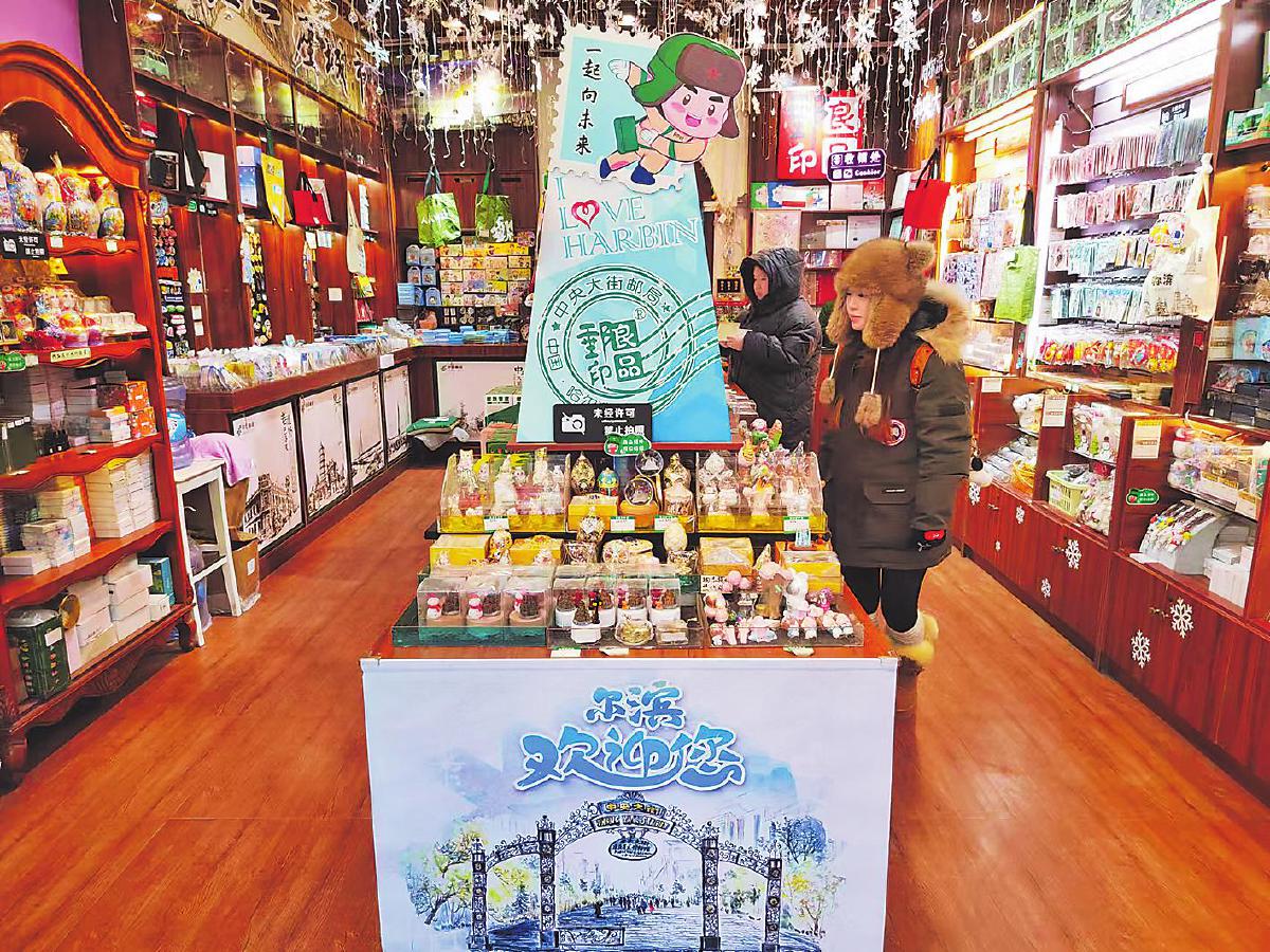 “我們是從漠河一路游玩到哈爾濱的,每到一處都要蓋上幾個紀念郵戳,買幾樣特色文創產品。中央大街郵局很有特色,紀念郵戳和明信片設計得都很漂亮?!币粚π∏閭H開心地展示著自己收集的各地郵戳和明信片。中央大街郵局內現有文創產品500多款,僅哈爾濱主題風光明信片就有100余種。在中央大街上能看到的糖葫蘆、馬迭爾冰棍、東北大苞米,還有哈爾濱著名的圣·索菲亞大教堂以及其他標志性景觀等,都被郵局“搬”到了屋里,成了精致可愛的文創產品。東北話徽章、栩栩如生的郵車模型等更是琳瑯滿目,讓許多游客久久移不開眼。