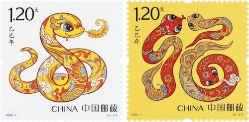 《乙巳年》特種郵票一套2枚,郵票圖案名稱分別為蛇呈豐稔、福納百祥。該套郵票以敦煌壁畫和傳統民俗為靈感來源,將蛇的形象與吉祥寓意巧妙結合,既體現了生肖文化的獨特魅力,又凝聚了樸素靈活的民間智慧。兩枚郵票不僅是對生肖之美的再次詮釋,更是對時和歲豐、福澤四季的深情祝福。郵票第一圖“蛇呈豐稔”,畫面提煉了中華傳統文化中盤蛇的靈動意象,加以喜慶裝飾應和年節氛圍。金色的蛇軀蜿蜒,口中銜著一束“嘉禾”,象征著“倉廩實,衣食足”的美好圖景。蛇身金光熠熠,與璀璨的麥穗交相輝映,仿佛繪就了一幅豐收時節金光燦爛、富饒滿溢的畫卷,寓意著風調雨順之年、五谷豐登之景,以及國泰民安的盛世祥和。郵票第二圖“福納百祥”,畫面以草書筆意將三條蛇創意性地構成了“福”的字形,簡練灑脫、柔美順通。兩大一小三條蛇之間情感細膩流動,顧盼生情,生動展現了闔家歡樂的溫馨場景,寓意著和合共生、福滿人間,寄托了人們對美好生活的無限追求與誠摯祈愿。該套郵票由北京郵票廠有限公司采用膠雕套印工藝印制,全套郵票面值為2.40元,計劃發行套票2680萬套、版式二162萬版、小本票387萬本。