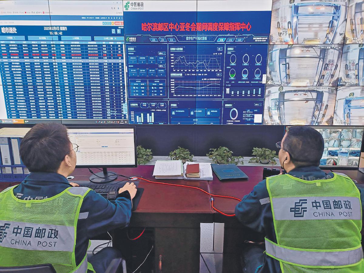 郵政工作人員在監控室護航亞冬會郵件安全。□羅輝 攝