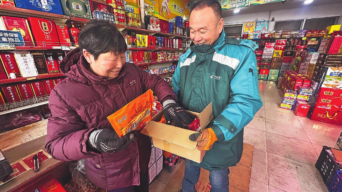 春節期間,馬鑫來到阿城區新興村的便民超市上門取件。 □冷美良 攝