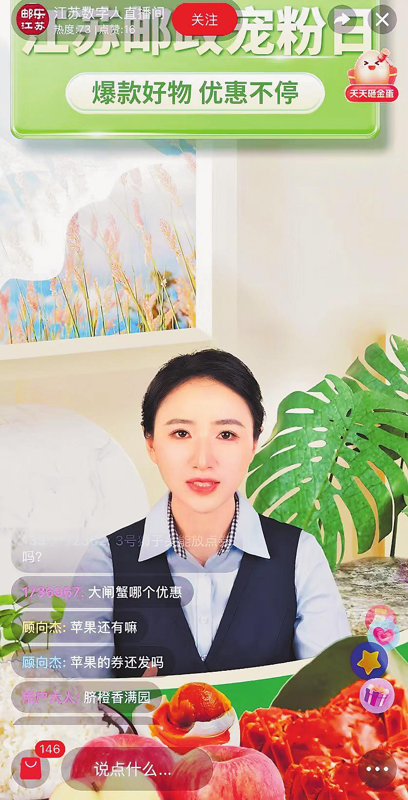 “每一口,都能感受到牛肉的鮮美和高原的純凈……”2024年3月4日,一身大紅色衛衣、體態端莊、表情親和的數字人“小郵”,首次亮相“江蘇郵政寵粉日”主題直播活動,語言流利地兜售著各地優質農產品。“蛋黃中的油脂晶瑩剔透,散發著濃郁的香氣。蛋白則如同玉石般光滑細膩,令人垂涎欲滴。我們還提供了多種口味供您選擇,包括原味、香辣味、香蔥味……”8個月后,郵樂江蘇數字人直播間“雙11”寵粉專場,第二期數字人、江蘇金牌主播潘佳的數字克隆體,又在向“寶子們”推薦江蘇優質特產高郵咸鴨蛋。