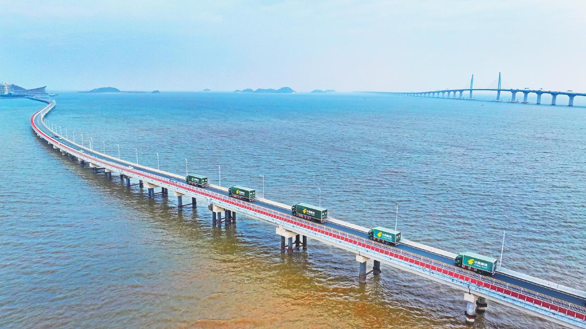 郵政車隊在港珠澳大橋的引橋上有序前行,宛如一條綠色的絲帶連接著粵港澳大灣區。郵政服務為區域內的物流運輸和經濟交流提供了有力支持,促進了大灣區物流一體化進程,助力區域經濟的繁榮和發展。 □陳師 攝