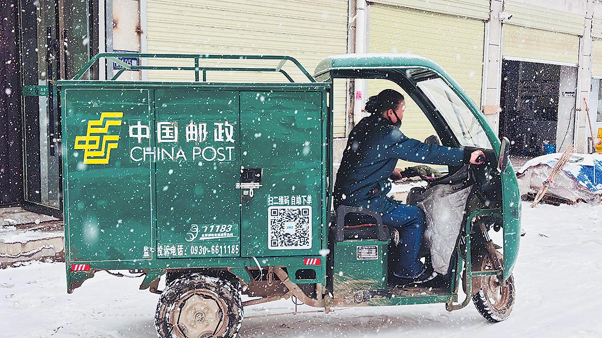 3月5日,甘肅省積石山縣遭遇強冷空氣,紛紛揚揚的大雪從天而降,道路積雪深厚,氣溫驟降至-4℃,給交通和物流帶來極大不便。銀裝素裹中,郵政人以高度的責任感和使命擔當確保黨報黨刊、郵件及時送達,為人民群眾傳遞全國兩會聲音。