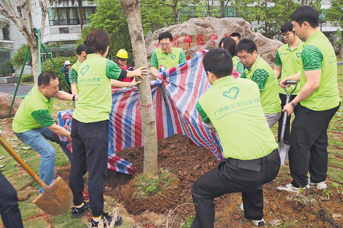 3月12日是第47個全民義務(wù)植樹節(jié),廣州郵區(qū)中心開展了義務(wù)植樹活動?;顒蝇F(xiàn)場,志愿者們熱情高漲,揮鍬鏟土、摘葉剪枝、扶樹培土、提桶澆水,大家團結(jié)協(xié)作、干勁十足?!蹶愒病£惥w民 攝影報道