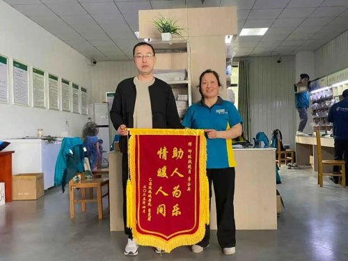 4月14日,湖北荊州市沙市區太岳攬投部上演感人一幕,市民陳先生將一面寫著“助人為樂 情暖人間”的錦旗交到郵遞員李合英手中,代表其85歲父親感謝她的救命之恩。