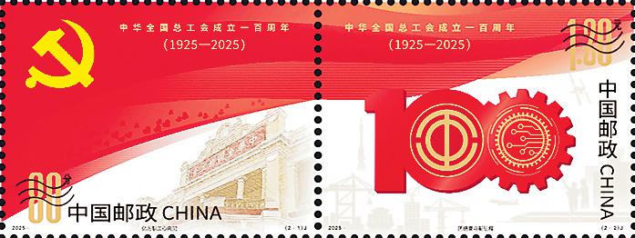 1925年5月1日,中華全國總工會在廣州正式成立。百年來,在黨的領導下,中華全國總工會櫛風沐雨,始終與黨同心、跟黨奮斗,前赴后繼、奮勇拼搏,艱苦奮斗、建功立業,譜寫了壯麗的篇章?!吨腥A全國總工會成立一百周年》紀念郵票圖案采用連票設計形式,以紅色為主色調。第一枚“億萬職工心向黨”,以黨徽、中華全國總工會廣州舊址為畫面主體,以意象化的紅旗為背景,并點綴心形圖案,象征中華全國總工會初心向黨,在黨的領導下走過百年光輝歷程。第二枚“團結奮斗新征程”,將中華全國總工會會徽、齒輪、芯片等與數字“100”組合設計,以意象化的紅旗為背景,并輔以城市建筑、港口、高鐵、飛機、火箭、空間站及勞動者等元素,象征著進入新時代以來,中華全國總工會在黨的領導下不斷奮進,為實現中華民族偉大復興作出更大貢獻。