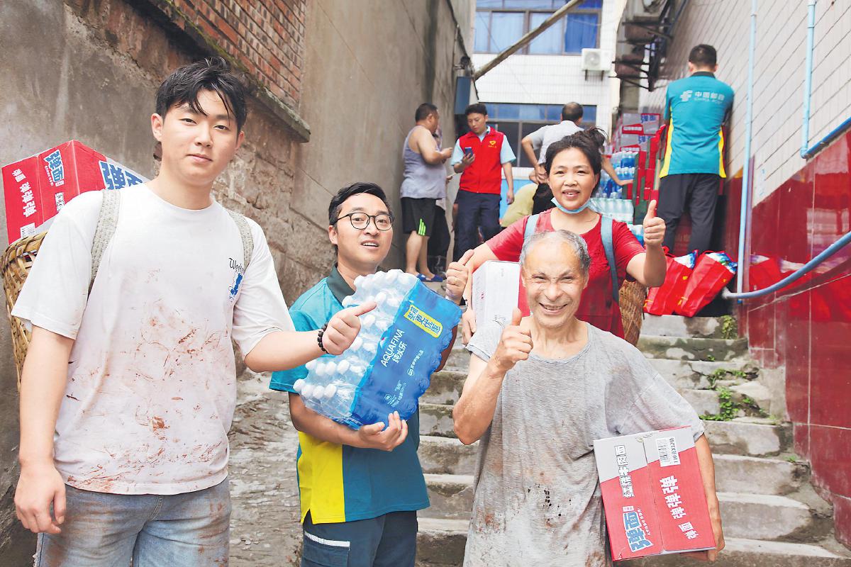 沒過多久,受災居民陸續趕來。他們有的背著背簍,有的赤著腳,褲腳上沾滿了泥土,衣衫被汗水濕透。餐飲店經營者丁平拿到物資后,連連道謝:“太感謝你們了,這些物資真是解了我的燃眉之急!”
