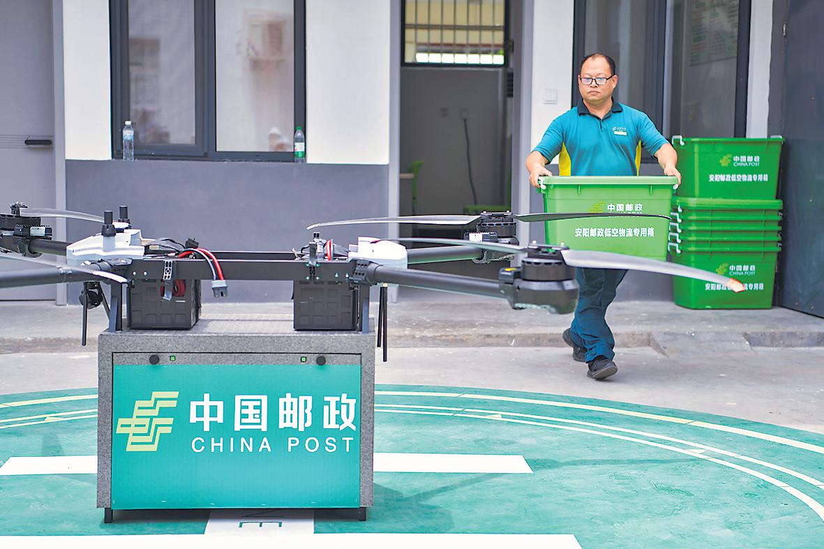 6月17日,在河南省林州市石板巖鎮(zhèn)郵政支局,伴隨著螺旋槳的嗡鳴聲,一架載重50公斤的無人機從停機坪騰空而起,載著郵件飛向海拔1300米的上坪村。7分鐘后,隨著無人機在上坪村的郵政低空物流驛站穩(wěn)穩(wěn)降落,河南首條無人機山區(qū)郵路正式投入常態(tài)化運營。