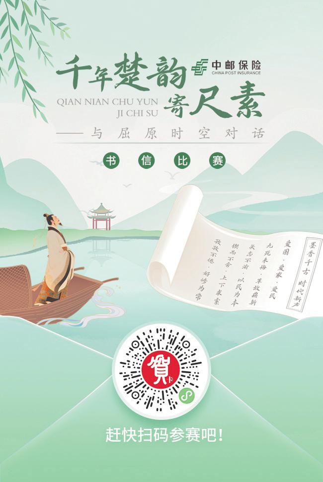 一紙方寸,千年楚魂。在《楚辭》特種郵票確定于5月31日首發(fā)后,湖北省郵政分公司提出以書信比賽為郵票發(fā)行引流造勢、同步推動函件業(yè)務(wù)發(fā)展的設(shè)想。5月11日,由中郵保險(xiǎn)冠名的“千年楚韻寄尺素——與屈原時(shí)空對話”書信比賽橫空出世。此次比賽最大的亮點(diǎn)是參賽作品通過“寄賀卡”小程序線上征集,這也是中國郵政首次利用線上小程序開展的書信比賽活動。