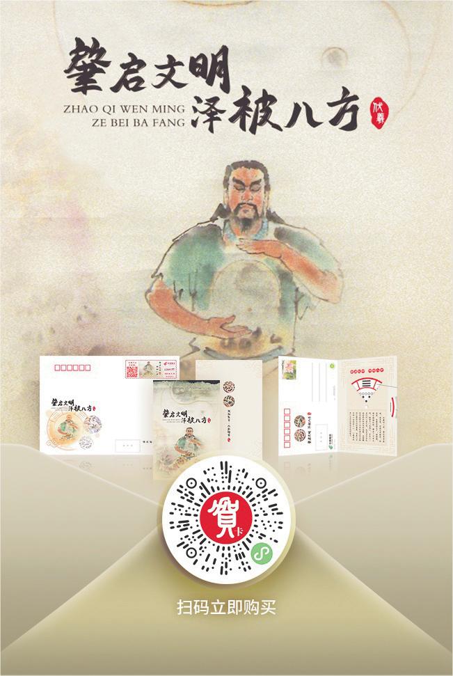 其中,《肇啟文明 澤被八方》明信片的設計十分新穎,畫面以水墨為底,暈染出伏羲的神韻,仿佛能看到遠古智者的沉思;一幅可轉動的八卦圖嵌入其中,輕輕撥動,“乾、坤、震、巽……”這些蘊含宇宙相生規律的符號緩緩流轉,如同將“萬事順意、生生不息”的祈愿,通過指尖的觸碰傳遞到心底;配套的定制信封,印刻“羲皇賜福·八卦承吉”字樣,羲皇形象與傳統八卦、祥瑞圖案相互交融。