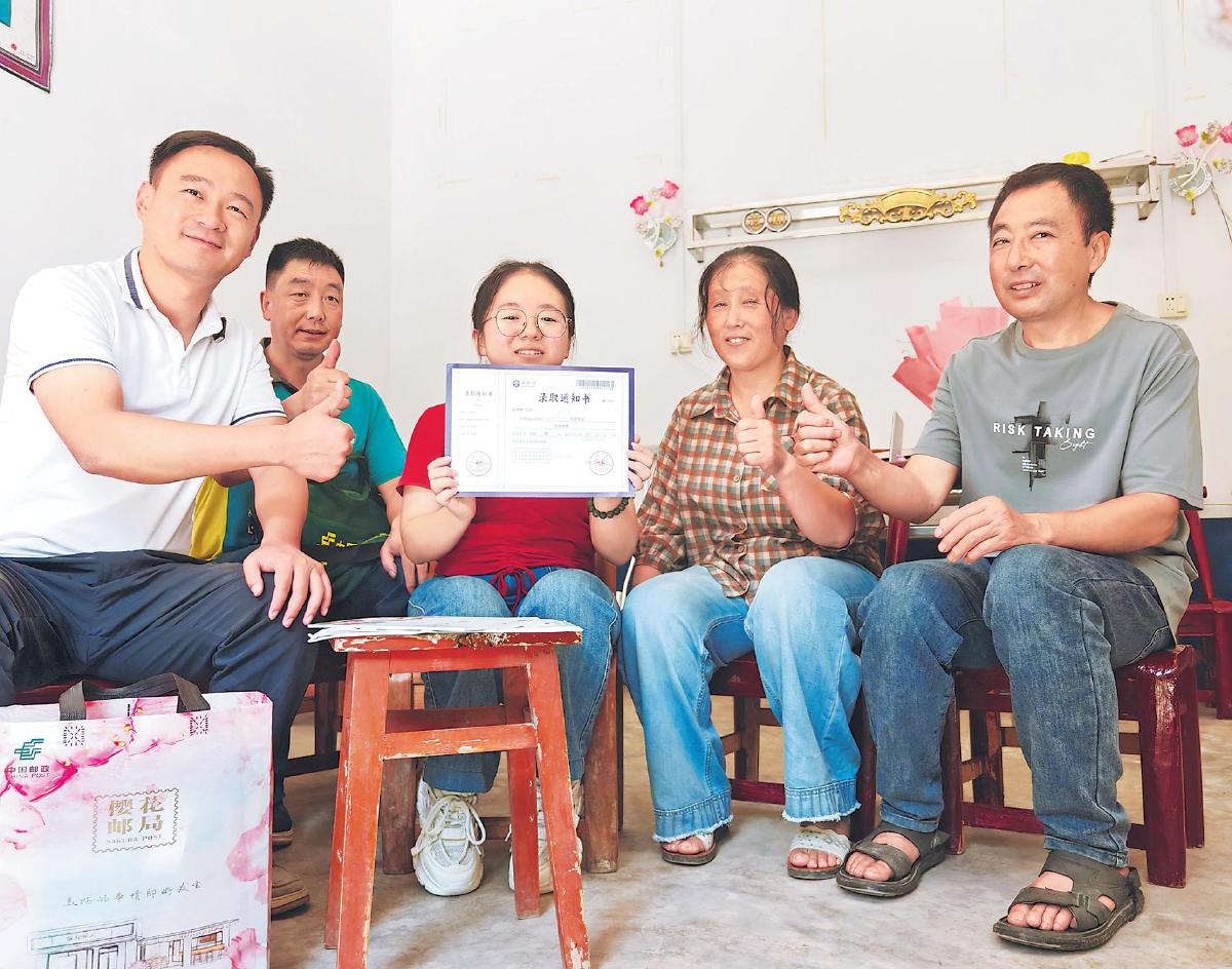 其實,郵車引擎聲剛靜下,民居的主人田艷青就和父母從屋里笑著迎了出來。按照流程完成簽收后,曾經為田艷青打造了“一個人的小學”的支教老師袁輝從人群中驚喜現身。“袁老師!”現場響起激動的輕呼,田艷青當即邀請袁輝與她一起拆開錄取通知書郵件。一側,看著這個場景的田艷青母親嘴角漾著欣慰的笑容,透過她噙著淚水的雙眼,10余年的時光似乎交疊濃縮,2012年袁老師首次上門為青青授課的畫面正與眼前這一刻重合……
