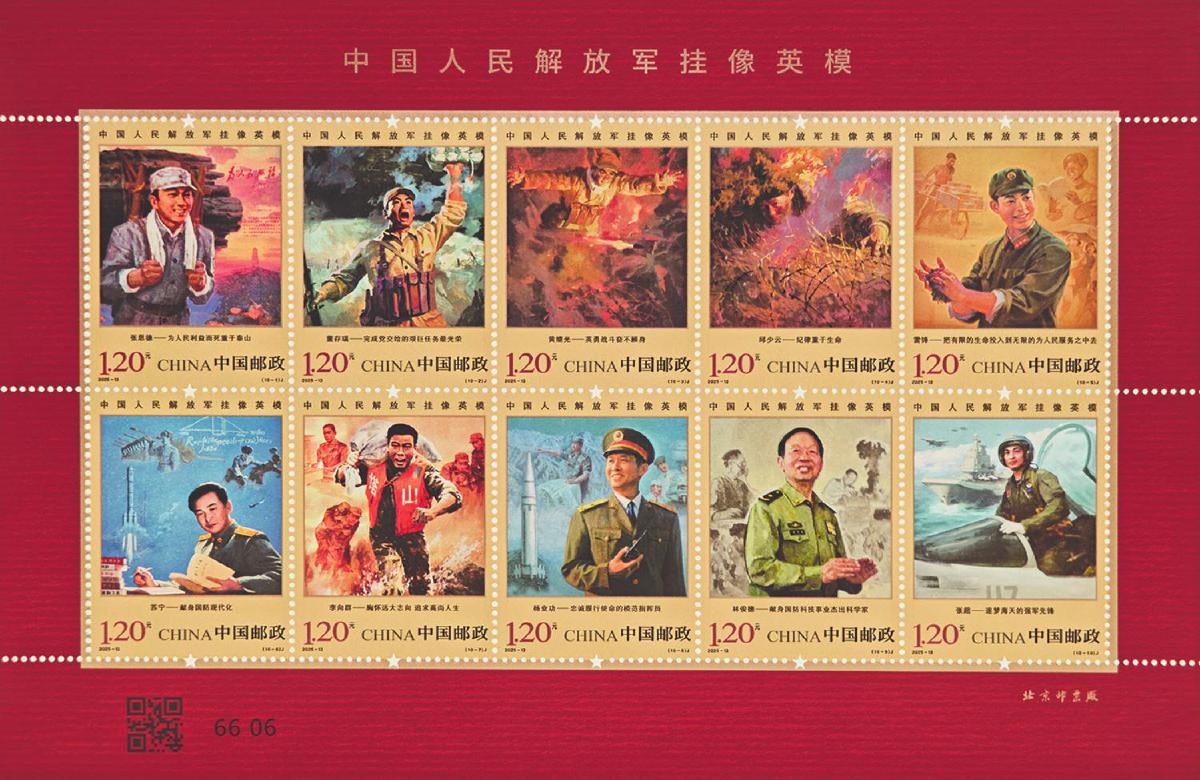 8月1日,《中國人民解放軍掛像英模》紀念郵票發(fā)行。該套郵票一套10枚,展現(xiàn)的英模人物分別是:張思德——為人民利益而死重于泰山,董存瑞——完成黨交給的艱巨任務(wù)最光榮,黃繼光——英勇戰(zhàn)斗奮不顧身,邱少云——紀律重于生命,雷鋒——把有限的生命投入到無限的為人民服務(wù)之中去,蘇寧——獻身國防現(xiàn)代化,李向群——胸懷遠大志向追求高尚人生,楊業(yè)功——忠誠履行使命的模范指揮員,林俊德——獻身國防科技事業(yè)杰出科學(xué)家,張超——逐夢海天的強軍先鋒。
