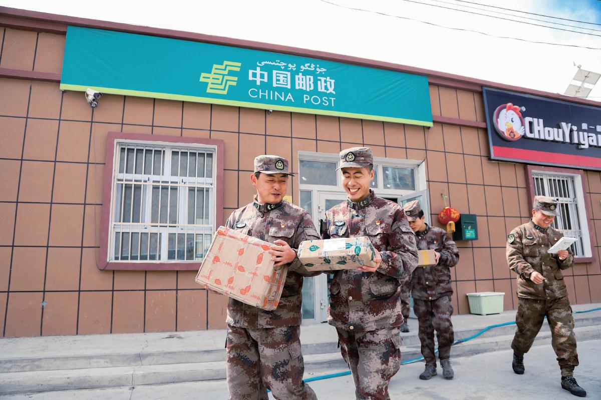 直達(dá)新疆葉城縣三十里營(yíng)房地區(qū)的郵路開(kāi)通后,駐地部隊(duì)官兵從郵政服務(wù)點(diǎn)高興地取出包裹。