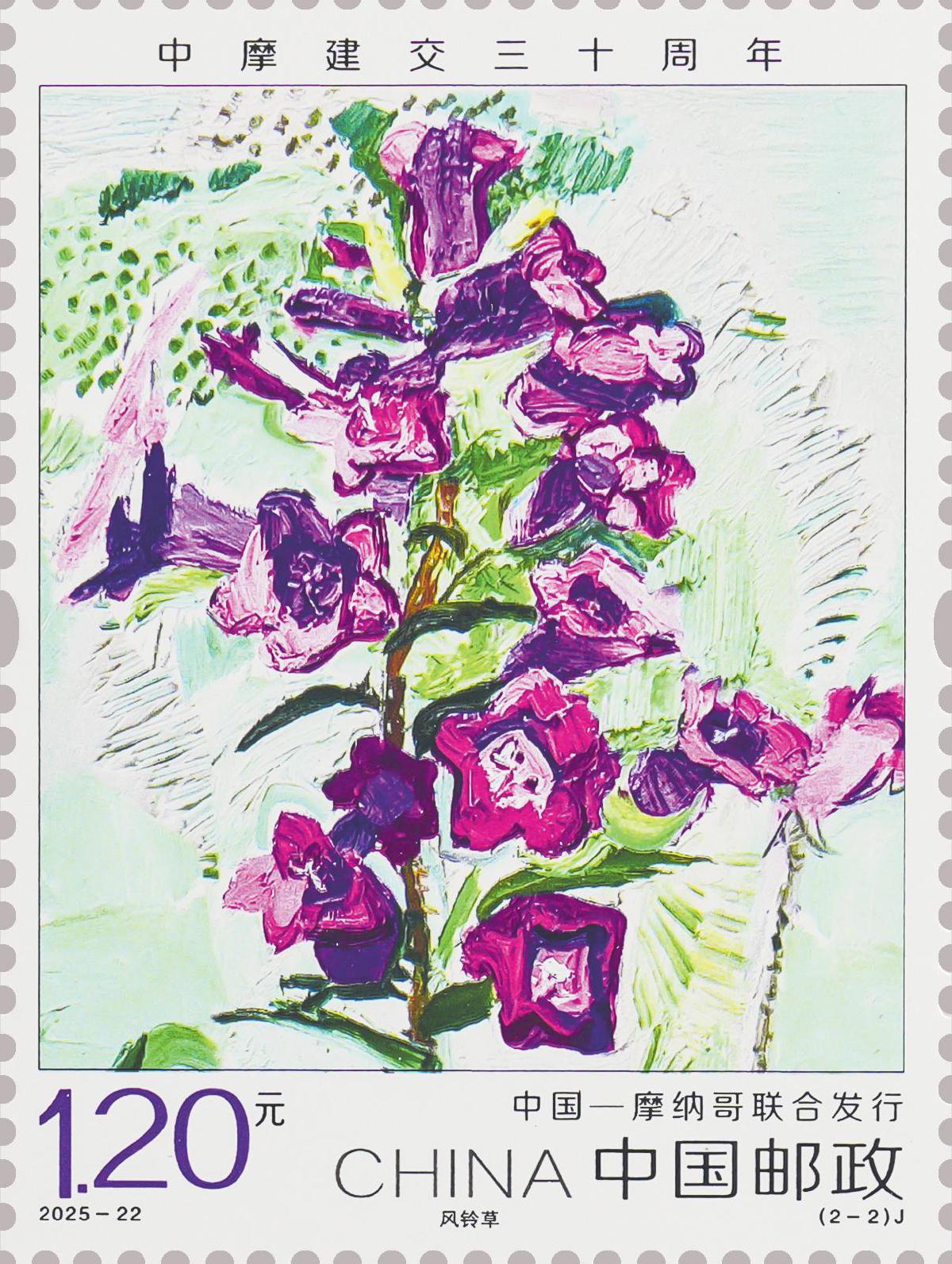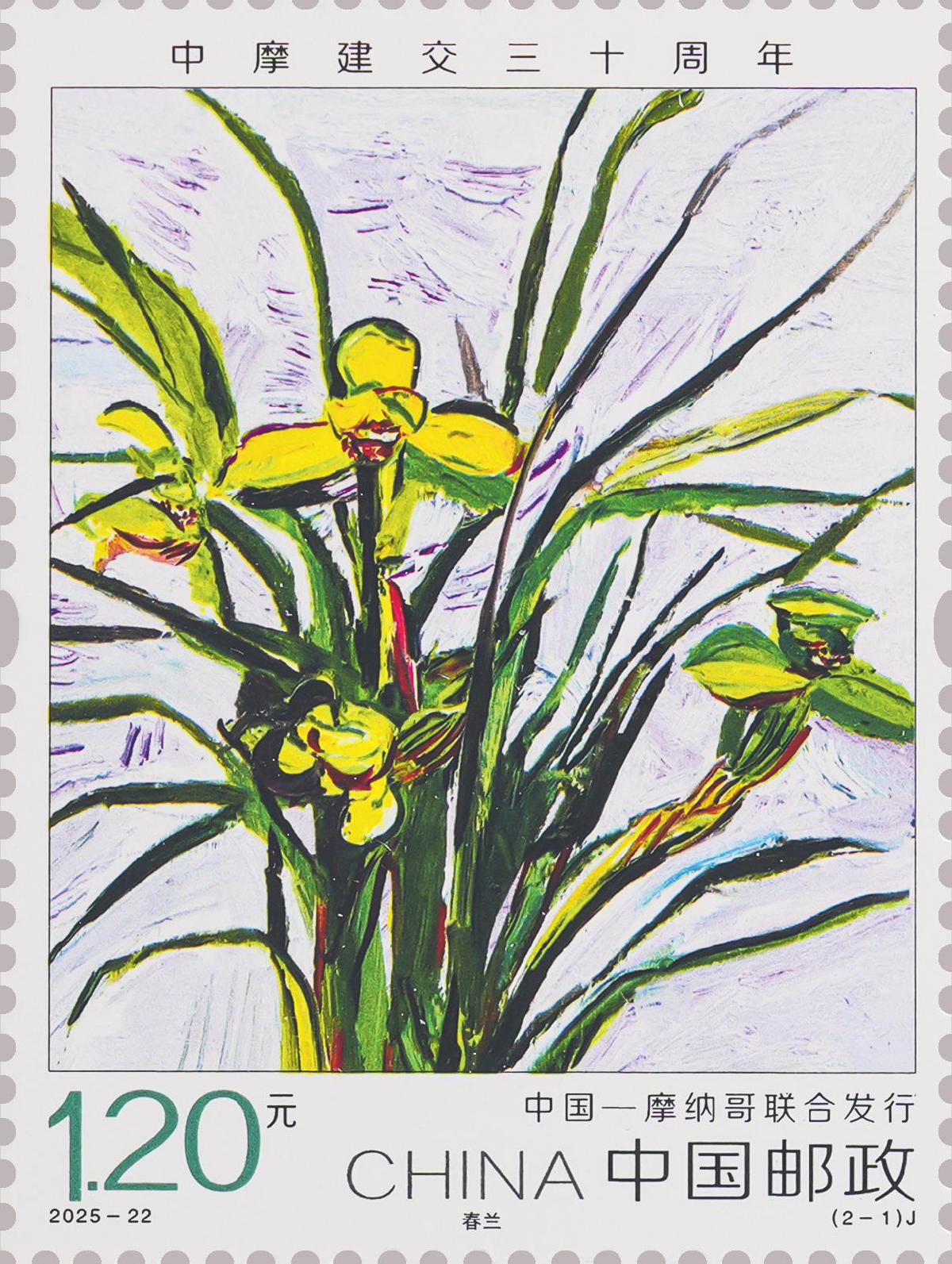 本套郵票分別選用具有兩國(guó)民族特色和深厚文化內(nèi)涵的花卉,中國(guó)選用栽培歷史悠久的春蘭,摩納哥選用美麗靈動(dòng)的風(fēng)鈴草,兩種花卉彰顯出生態(tài)文明的內(nèi)在價(jià)值與精神追求。郵票圖案采用油畫(huà)表現(xiàn)方式,設(shè)計(jì)師通過(guò)大膽的構(gòu)圖、恣意的筆觸、靈活的色彩搭配,對(duì)具體的物象進(jìn)行抽象提煉,從而營(yíng)造出一種生動(dòng)而富有生命力的畫(huà)面效果。兩枚郵票承載著“友誼長(zhǎng)存”的深層寓意,希望中摩關(guān)系不斷取得新進(jìn)展,更好造福兩國(guó)人民。