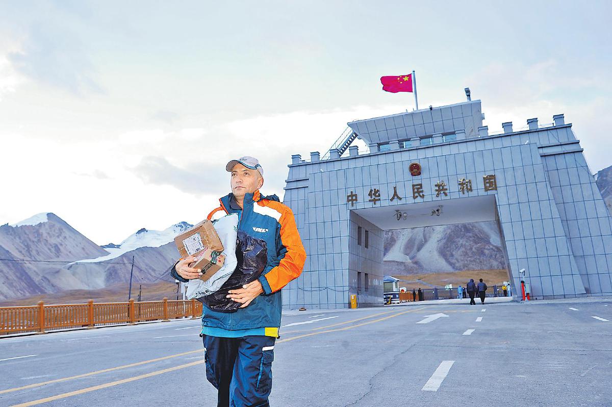 投遞員在紅其拉甫國(guó)門(mén)投遞郵件。