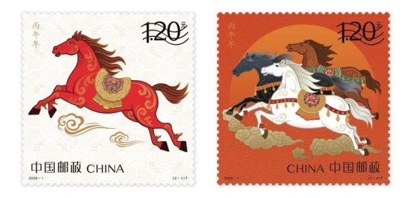 《丙午年》特種郵票由王紅衛、趙恩重設計。郵票第一枚圖名為“馳躍宏圖”,以“騰躍新時代”為核心意象,展現了一匹紅馬奔馳于祥云之上,鬃毛如焰,四蹄生風;第二枚圖名為“萬駿臻福”,以“萬馬奔騰,馳騁千里”為核心意象,展現了三匹奔跑的駿馬,三為眾,寓意奔騰不息、共同奮進。圖案背景及馬身輔以祥云紋、火焰紋、纏枝紋等傳統吉祥紋樣,既隱喻福運連綿,亦強化東方美學底蘊。郵票中的駿馬既展現出“一馬當先”的開拓氣概,也詮釋了“萬馬奔騰”的團結力量,將馬的形象與新時代中國人民奮發進取的精神風貌完美融合于方寸之間。