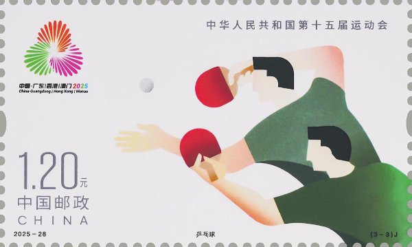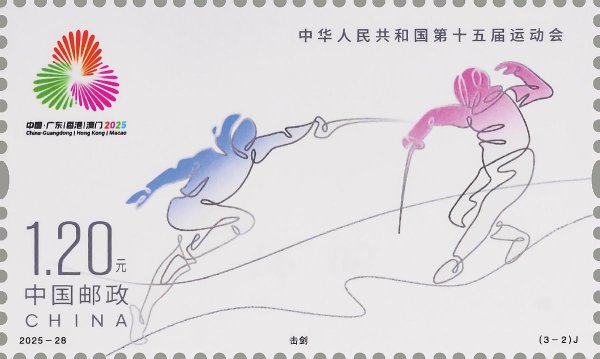 第十五屆全運會是粵港澳三地承辦的我國規模最大、水平最高、影響最廣的綜合性運動會,也是香港、澳門首次承辦全國運動會。該套郵票由內地、港、澳三地設計師韓家英、陳幼堅、歐俊軒設計。第1枚郵票表現內容為花樣游泳,郵票圖案以躍動的剪影表現運動員的優雅身姿,力與美相生共舞,以獨特的視角展現出運動員在水中的靈動瞬間。第2枚郵票表現內容為擊劍,郵票圖案以飛動的線條表現運動員迅猛矯健的身姿,剛與柔交織碰撞,以極簡的構圖展現出運動員激烈的對抗場景。第3枚郵票表現內容為乒乓球,郵票圖案以鮮明簡練的色塊表現運動員蓄勢待發的專注之姿,強與韌相融并濟,以幾何化、概括化的現代極簡插畫造型,展現出運動員發球瞬間的氣勢和張力,營造出緊張的比賽氛圍。