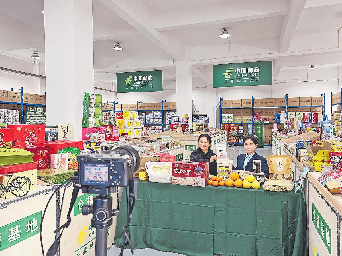 永嘉郵政組織“郵樂小店”店主在倉儲中心進行直播?! 踔苄佬隆z