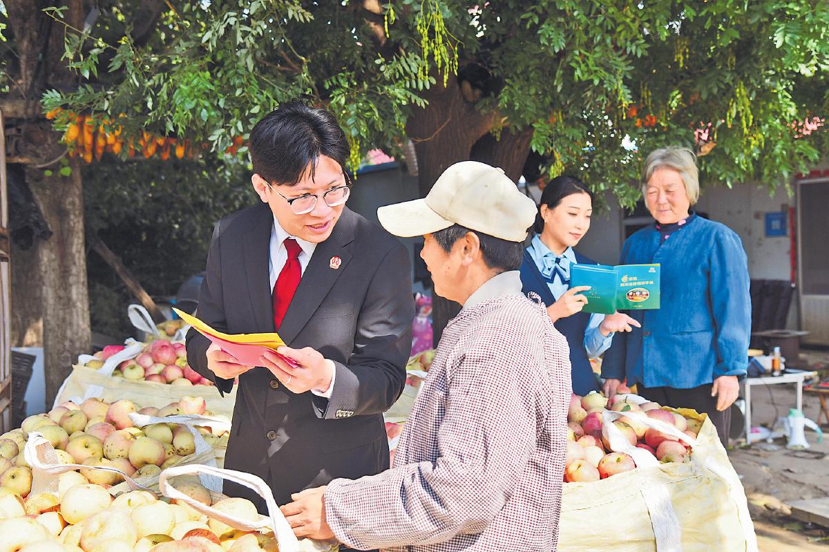 10月21日,沂源縣人民法院四級法官助理黃旭東和郵政工作人員一起在北店子村向果農宣講法律知識。