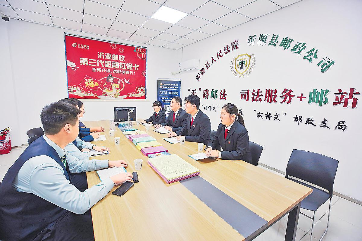 張家坡,山東省淄博市沂源縣東南30公里處的小鎮。鎮上的張家坡郵政支局里,藏著一項不尋常的服務——法郵服務站的司法服務。這是山東省高級人民法院與山東省郵政分公司攜手打造的“楓橋式”基層治理新樣板,也是司法服務“貼地而行”的生動實踐。群眾在“家門口”的郵局就能進行立案、咨詢、調解,甚至參與庭審;法律不再遙不可及,而是“一路有法、‘沂’路‘郵法’”。