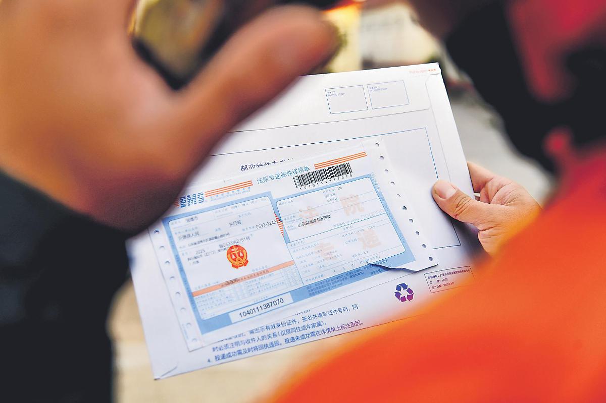 沂源縣郵政分公司投遞員在投遞司法文書前聯系收件人。