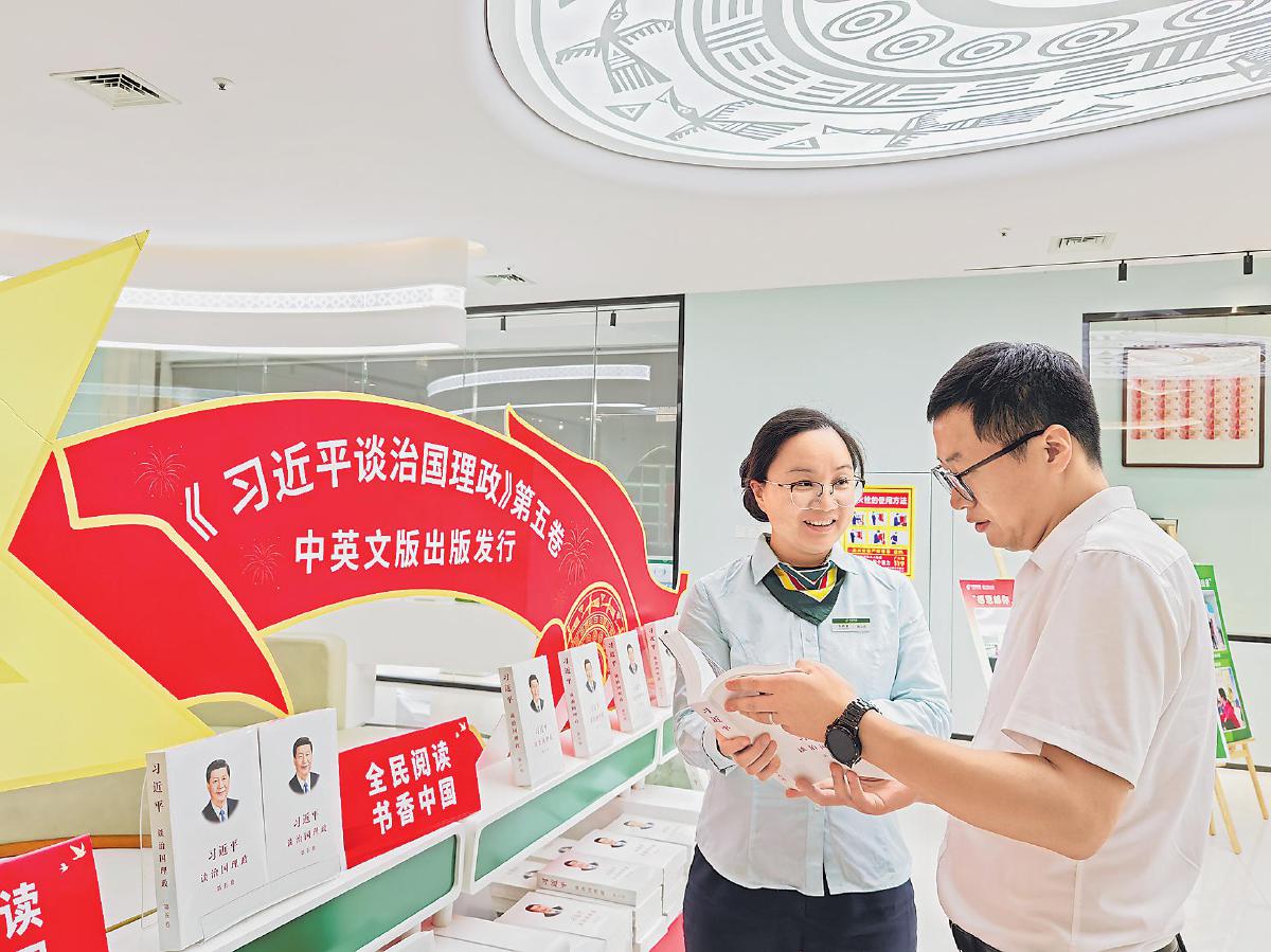 近日,走進(jìn)廣西壯族自治區(qū)南寧市金浦路郵政支局,一抹鮮艷的紅色映入眼簾,紅色背景的展板下,整齊排列著《習(xí)近平談治國理政》第五卷圖書。不少讀者在此駐足,有的神情專注地翻看,有的在聆聽工作人員介紹。市民張先生在選購圖書的人群里格外顯眼,他不僅自己購買,還打算幫家人和朋友代買。他表示,自己是一名黨員,《習(xí)近平談治國理政》第五卷圖書對(duì)提升黨性修養(yǎng)和理論素養(yǎng)大有裨益?!霸卩]政網(wǎng)點(diǎn)能夠買到正版重點(diǎn)圖書,十分方便,工作人員很貼心地向我介紹圖書的信息?!睆埾壬f。